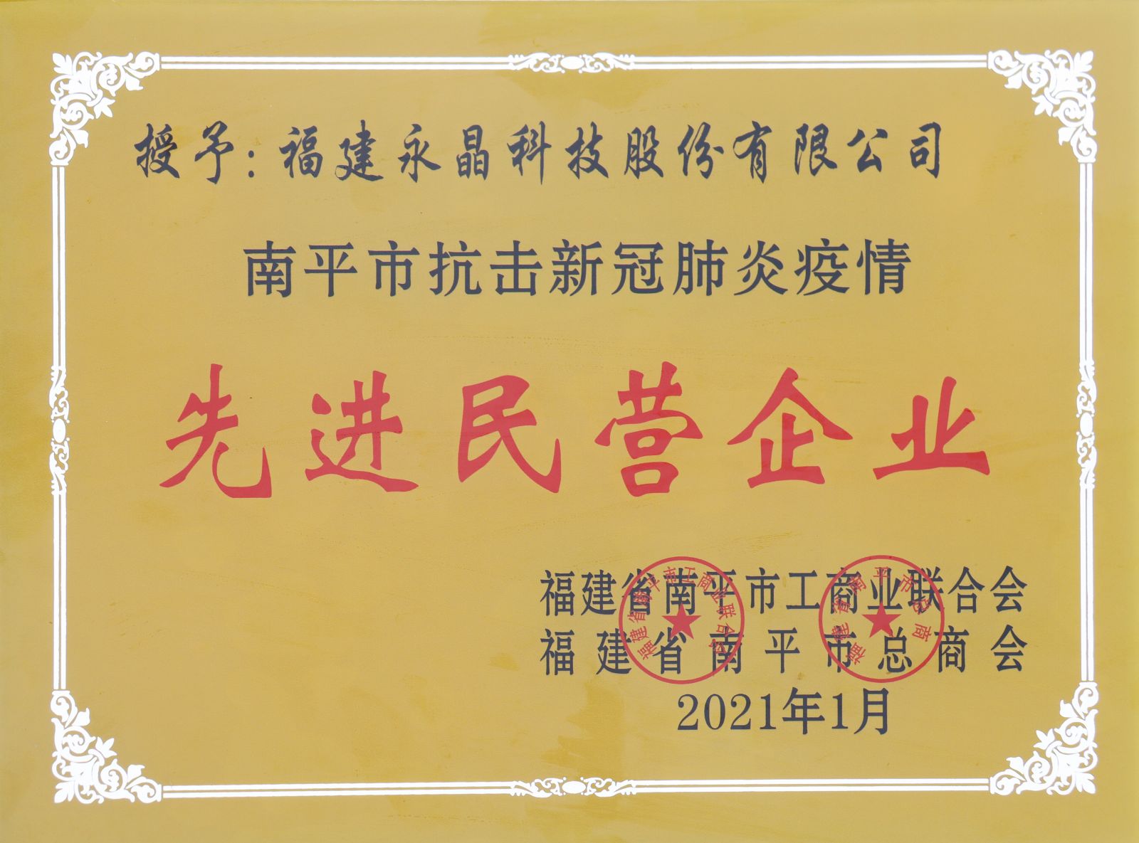 本次榮獲“南平市抗擊新冠肺炎疫情先進(jìn)民營企業(yè)”稱號(hào),是各級(jí)政府對永晶科技積極承擔(dān)社會(huì)責(zé)任的認(rèn)可。永晶科技將珍惜榮譽(yù)、再接再厲,在高質(zhì)量發(fā)展經(jīng)濟(jì)的同時(shí)進(jìn)一步弘揚(yáng)企業(yè)精神和家國情懷。